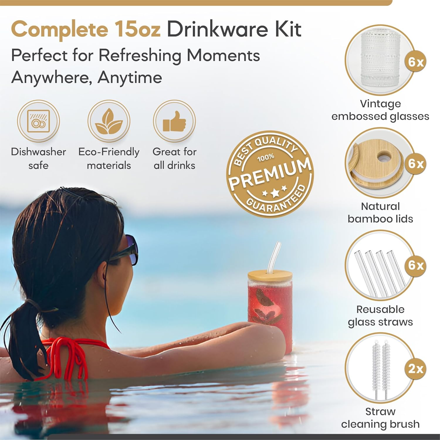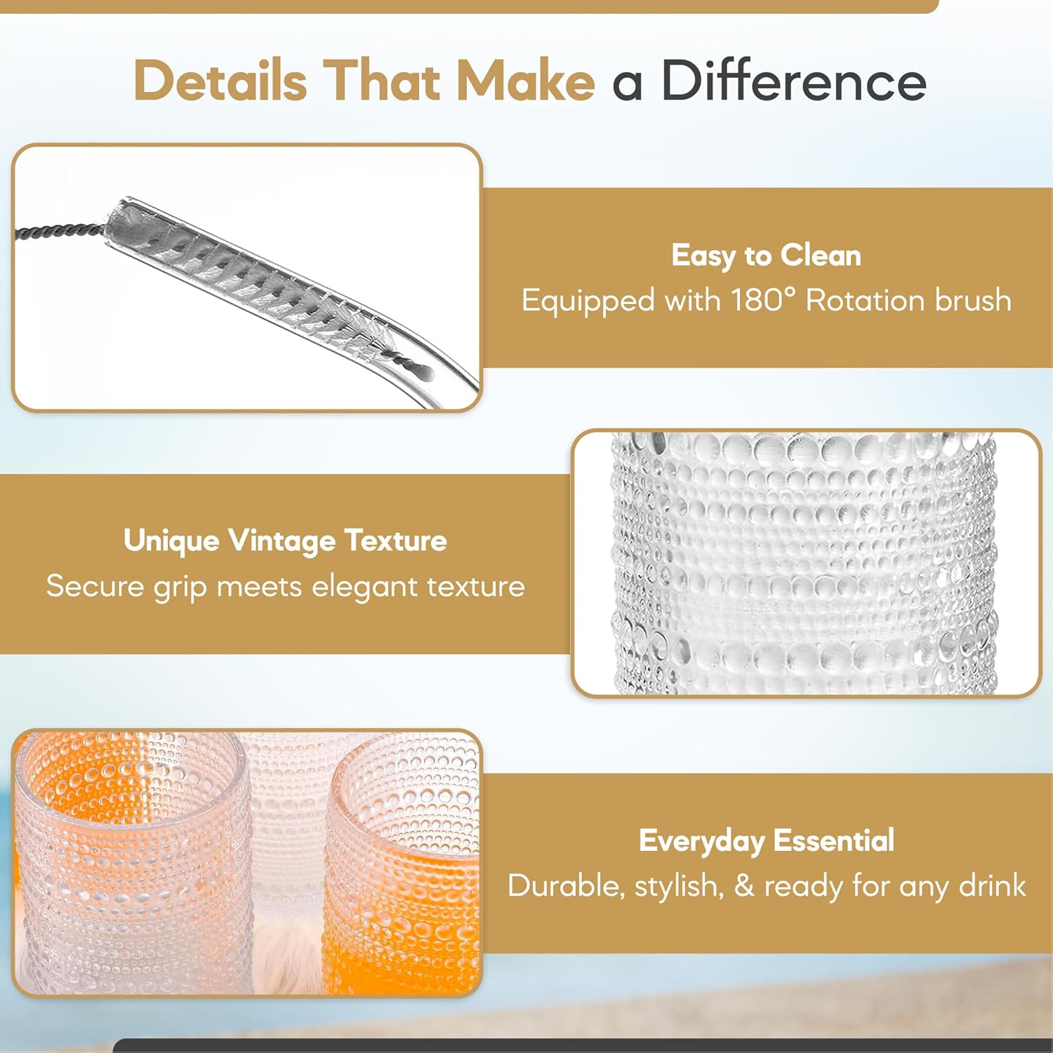 - Complete 6-Piece Set Everything You Need for Daily Use: This drinkware set includes 6 vintage 12oz beaded glasses, 6 reusable glass straws, 6 bamboo lids, and 2 cleaning brushes, providing a complete, ready-to-use solution for your favorite drinks. Great for home use, entertaining guests, or adding elegance to your coffee and cocktail station.