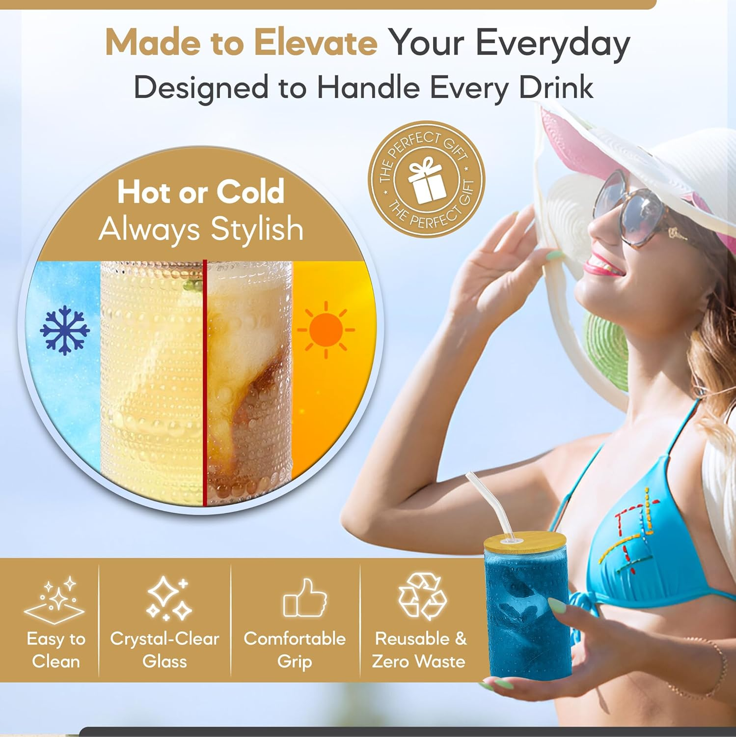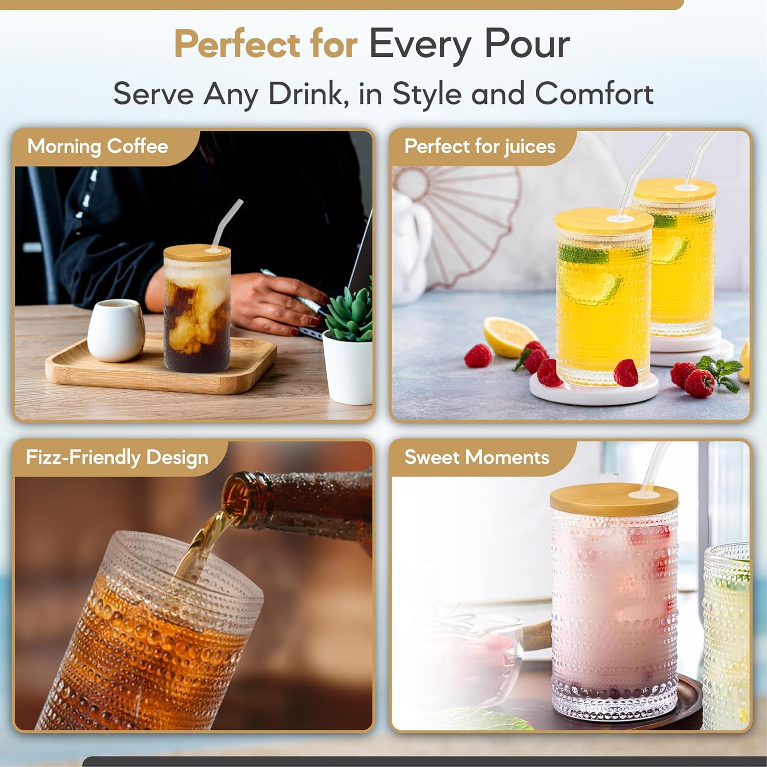 - Eco-Friendly Lids and Straws, Sustainable and Reusable Design: Each glass cup comes with a natural bamboo lid and a reusable glass straw, offering a stylish, eco-conscious alternative to single-use plastic. The snug-fitting lid helps prevent spills, while the smooth glass straw enhances your sipping experience—perfect for anyone embracing a low-waste lifestyle.