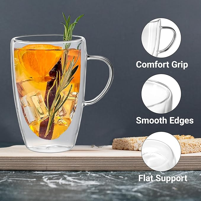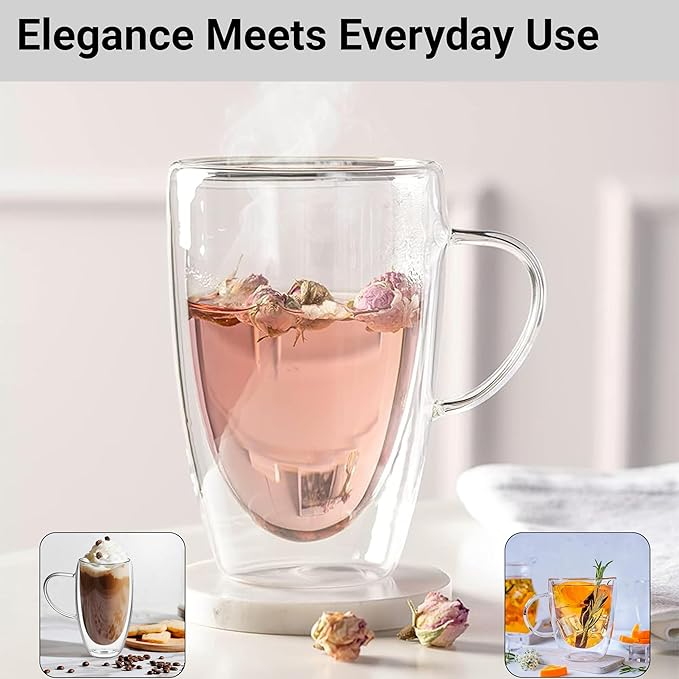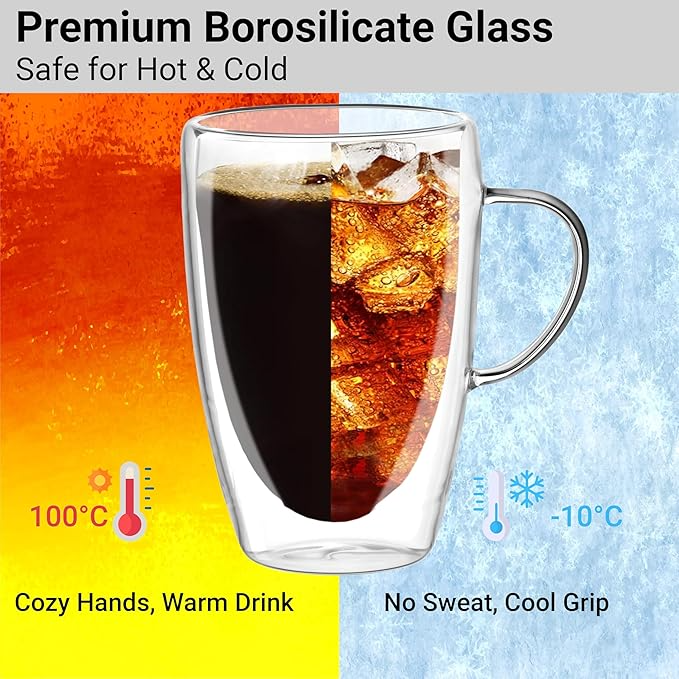 - Double-Wall Insulation – Keeps Drinks Hot or Cold Longer Enjoy your beverages at the perfect temperature with our double wall glass coffee mugs. Cool to the touch, condensation-free, and ideal for both hot and iced drinks.